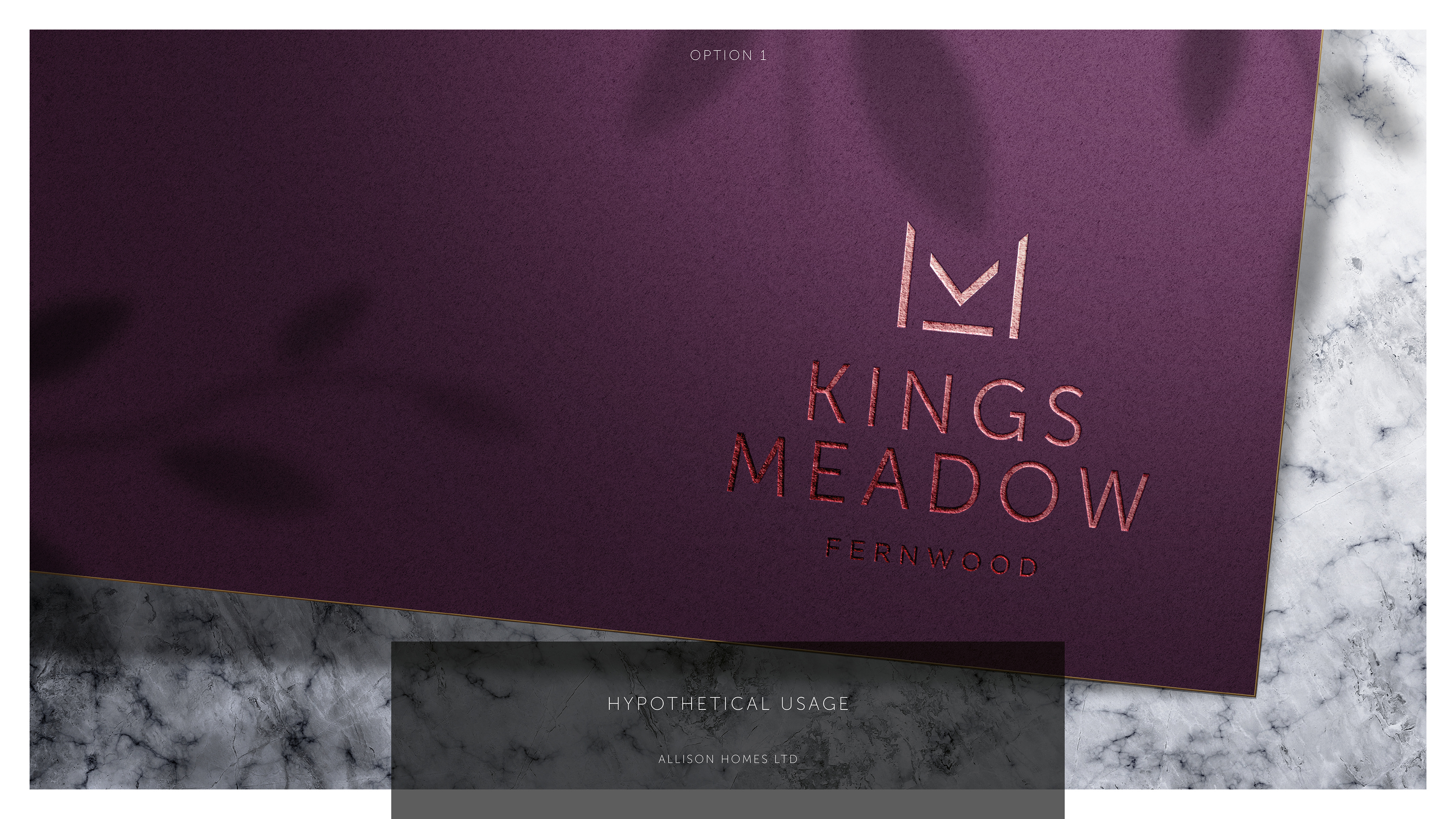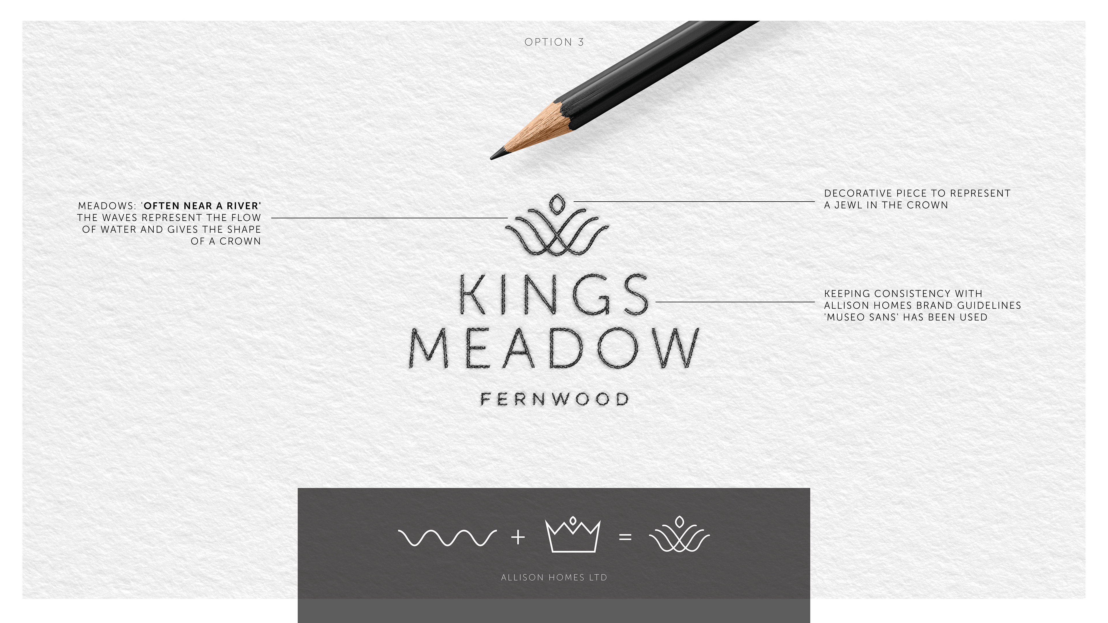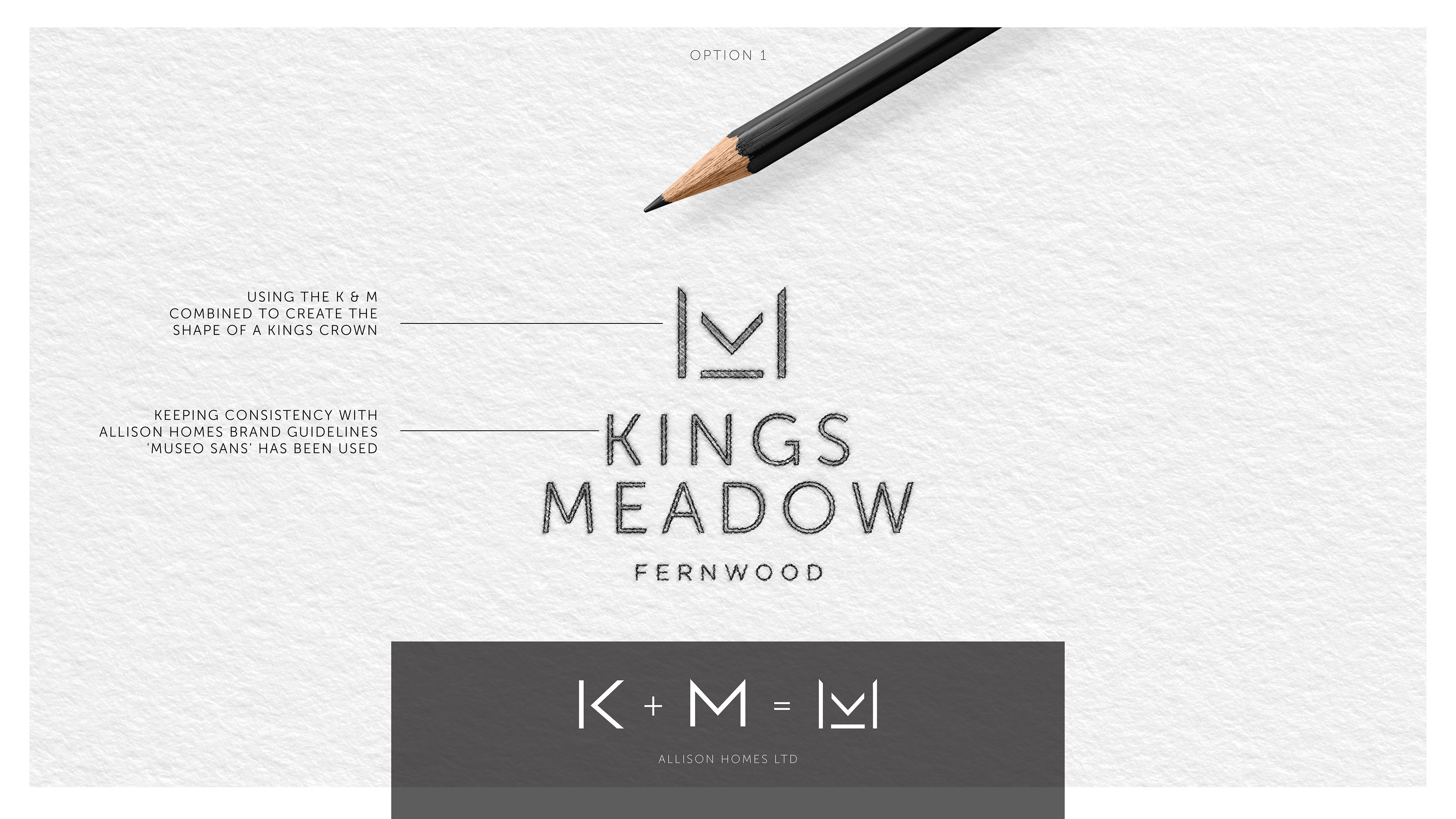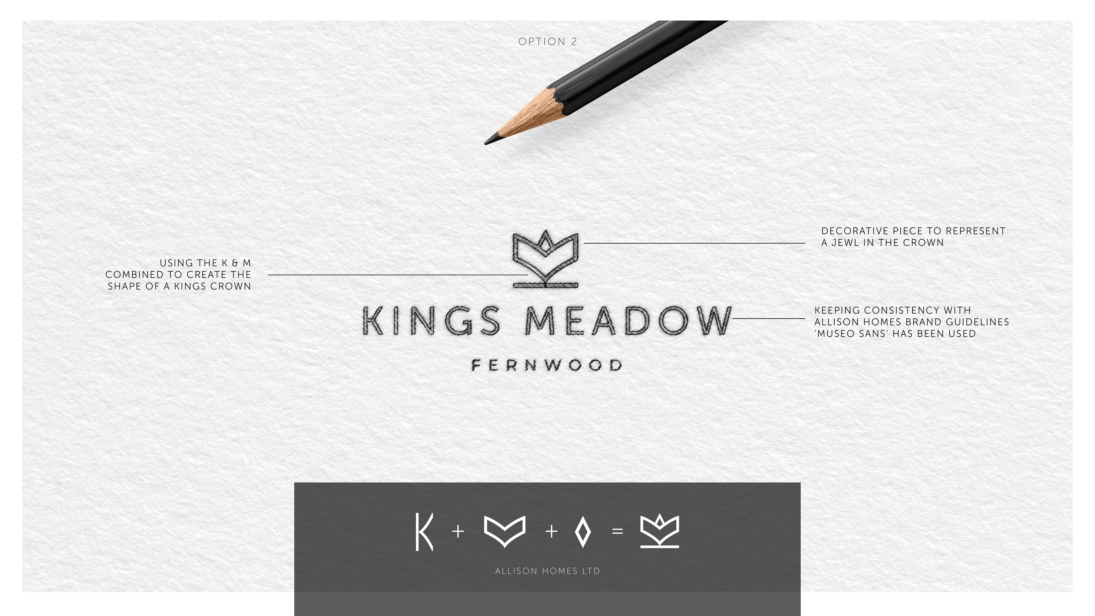 Branding concepts for a new development, these ideas stemmed from using the 'Kings' + 'Meadow' words. In turn this needed to show the way the first letters from each line could create a crown.